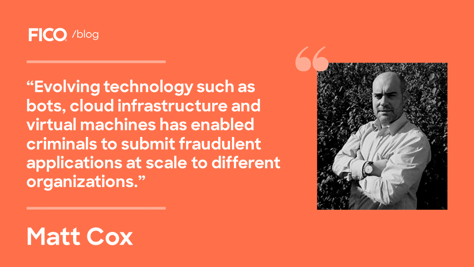 For fraudsters, this sharp and hasty shift to digital and the intense focus on customer experience has opened doors. Application fraud soared during the pandemic and continues to grow today. Evolving technology (bots, cloud infrastructure and virtual machines) has enabled criminals to submit fraudulent applications at scale to different organizations.