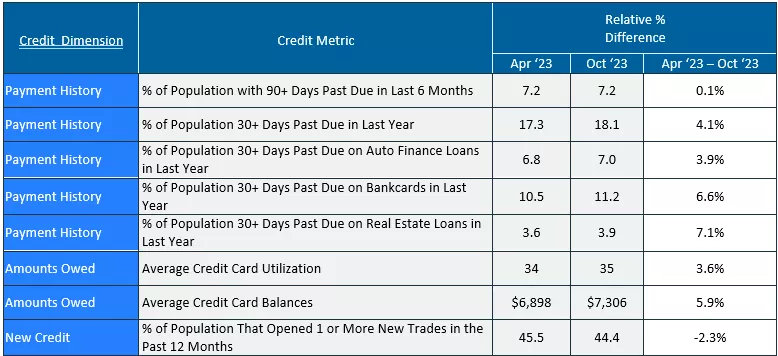 Figure 2. FICO® Score population has continued to degrade in key metrics between April and October 2023.