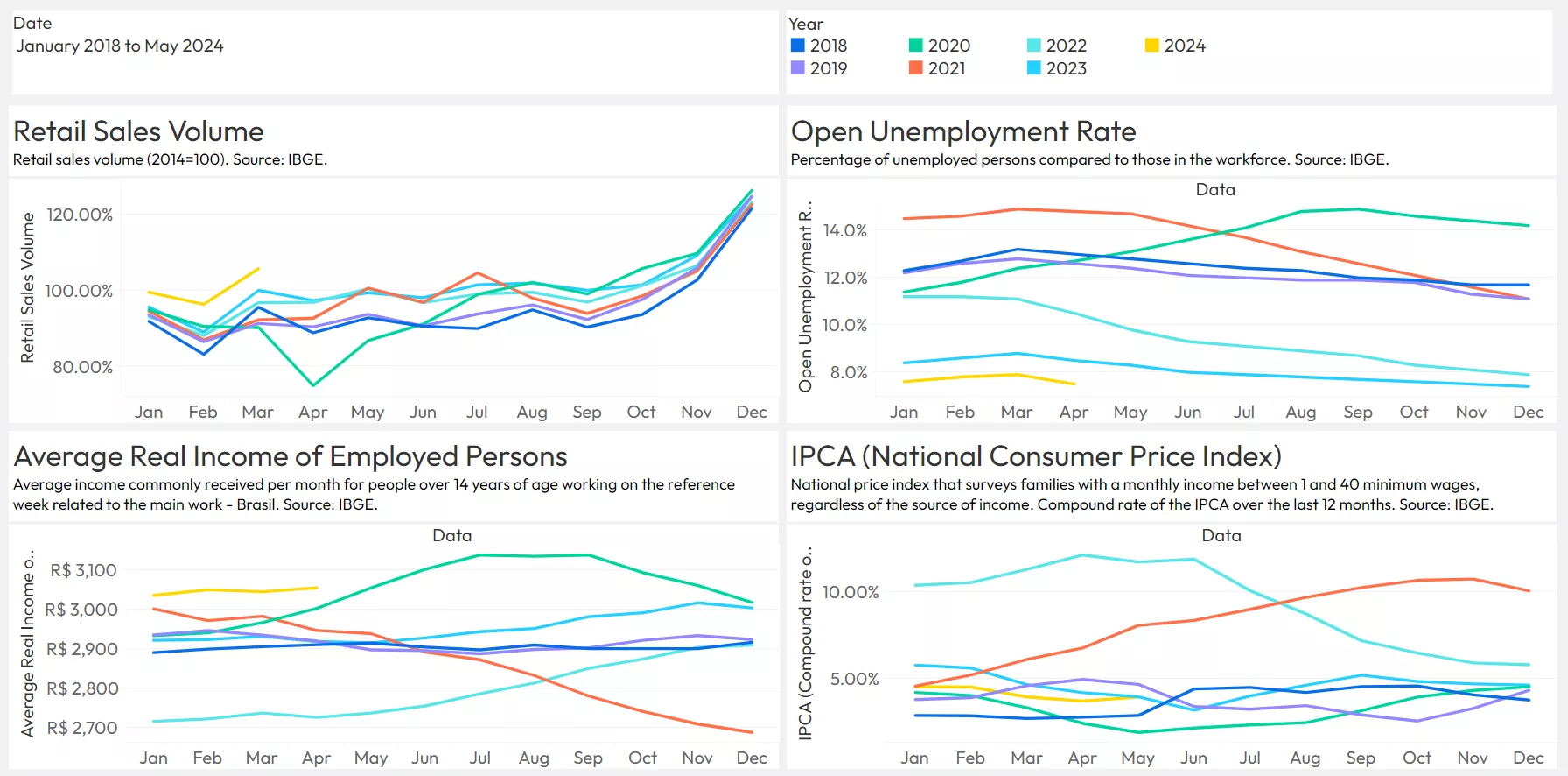 The macroeconomic analysis of the Brazilian market presents a positive national scenario, based in official data. Retail sales volume reached its highest year-opening rate recorded, with March hitting 105.86%. The Open Unemployment Rate also stands out for its ten-year low record, reaching 7.5% in April, second only to the historical minimum (2014). The Average Real Income of Employed Persons also reached its historical maximum in April, at R$ 3,056. Additionally, we noted a reversal of the progressive downward trend in IPCA (National Consumer Price Index) since October 2023, reaching 3.93% in May.