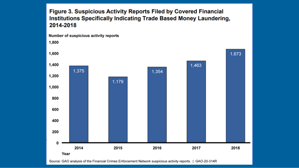 Financial institutions in the U.S. must report potentially suspicious activity (including trade-related transactions) to FinCEN. The graph below shows the trend of TBML-related SARs filed with FinCEN between 2014 and 2018. During this period, financial institutions filed 7,044 SARs specifically designated as suspected TBML/BMPE (Black Market Peso Exchange) activity, versus the more than 9.6 million SARs filed overall during the same period.