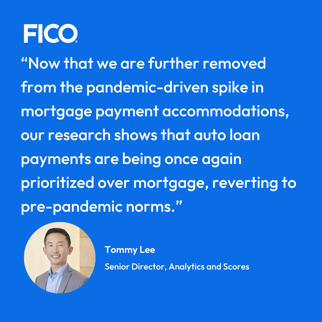 Now that we are further removed from the pandemic-driven spike in mortgage payment accommodations, our research shows that auto loan payments are being once again prioritized over mortgage, reverting to pre-pandemic norms. Both auto and mortgage continue to be higher in the payment hierarchy than unsecured products such as credit cards. (In our analysis dating back to 2005, auto and mortgage payments have been consistently prioritized over credit card payments.)