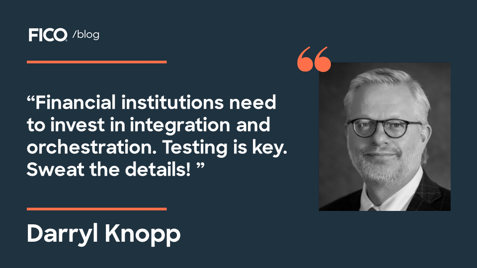 Financial institutions need to invest in integration and orchestration. Testing is key. Sweat the details!