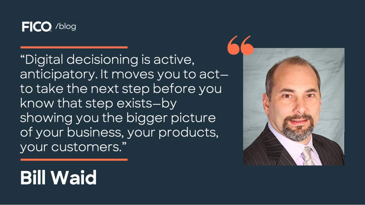 Digital decisioning is active, anticipatory. It moves you to act—to take the next step before you know that step exists—by showing you the bigger picture of your business, your products, your customers. With digital decisioning, split-second actions are continuously optimized for the best outcomes. Holistic, 360-degree customer views are powered by a tailored, ever-expanding data feed from multiple sources and the ability to seamlessly share “decision assets” across the company. Think: data characteristics, customer profiles, predictive analytics powered by machine learning, decision models and more.