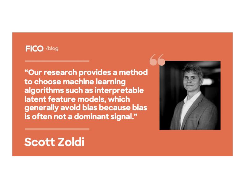 Almost three years ago I wrote about an analytic breakthrough developed in FICO’s data science labs called interpretable latent feature-based neural networks (ILF NNET). Our recent work with this method extends ILF NNET, demonstrating that it can help expose and eliminate biases derived from data showing up in the model. Even in cases where the data has been purposely skewed toward one subset of the population over another in the research lab, the method minimizes pick-up of those biased signals versus core relationships that matter. This is largely due to the fact that constraining the latent feature space removes noise and irrelevant correlation, where bias can be expressed.