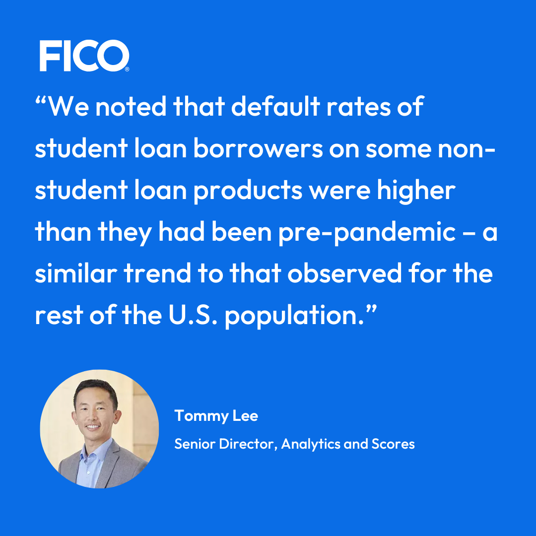 In our previous blog post on this topic, we noted how the student loan repayment pause led to disproportionately greater FICO® Score increases for student loan borrowers than non-student loan borrowers since the start of the pandemic. That’s because student loan borrowers don’t have new delinquencies on federal student loans and haven’t been required to make federal student loan repayments during the student loan forbearance period. Additionally, we noted that default rates of student loan borrowers on some non-student loan products were higher than they had been pre-pandemic – a similar trend to that observed for the rest of the U.S. population.