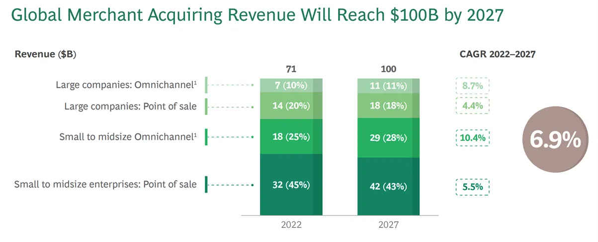 The merchant acquiring industry is not about basic payment processing—it's about strategic customer relationship management that drives measurable business growth. This industry is expected to reach a $100 billion market by 2027, according to a BCG report, with a growth rate of 6.9% between 2022 and 2027, where SME merchants with fewer than 250 employees are expected to make up 70% of the revenue base.
