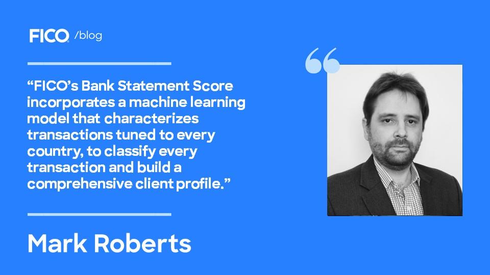 However, financial data alone won’t build the full picture. FICO’s Bank Statement Score incorporates a machine learning model that characterizes transactions tuned to every country, to classify every transaction and build a comprehensive client profile. Aggregating this information, we can assess potential risks and apply a risk score. Data derived is also not restricted to the bank’s data, but pulls from all real-time data available from open banking.