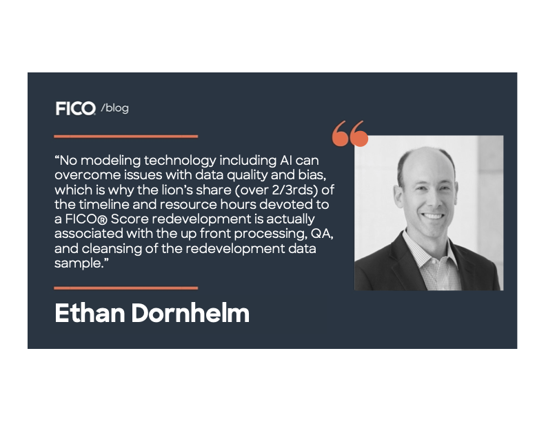 - No modeling technology including AI can overcome issues with data quality and bias, which is why the lion’s share (over 2/3rds) of the timeline and resource hours devoted to a FICO® Score redevelopment is actually associated with the up front processing, QA, and cleansing of the redevelopment data sample.