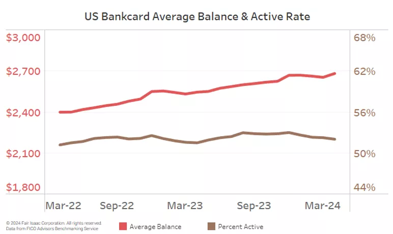 Higher interest rates on credit cards and increasing monthly spend to cover everyday purchases has led the average credit card balance on an increasingly upward trend since February 2022. As of March, the average credit card balance was $2,652, a 4.8% increase compared to March 2023. The active rate, defined as a credit card account being used for transactions or to carry a balance, has remained steady during the past two years at ~52%. This rate is 300 bps higher than the average active rate prior to the pandemic.
