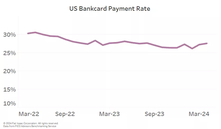 Although higher activity and usage of credit cards can be positive for lenders, it can also lead to potential problems if consumers cannot pay back their debts. In March the risk benchmarking data shows the credit card payment rate (percentage of previous month’s balance that was paid back) has leveled off at 27.2% despite a downward slide from its peak of 30.6% in May 2022. The positive news is that the payment rate in March is substantially higher than the pre-COVID average rate of 23.0% and is comparable to the payment rate in March 2023 of 27.6%. However, the percentage of active cardholders only paying the minimum amount due continues to climb, increasing from 6.4% in March 2023 to 7.3% this year. If a consumer does not pay their balance back in full at the end of the billing period they will owe interest on the remaining balance - ~55% of active cardholders are paying interest on their credit card balances each month.