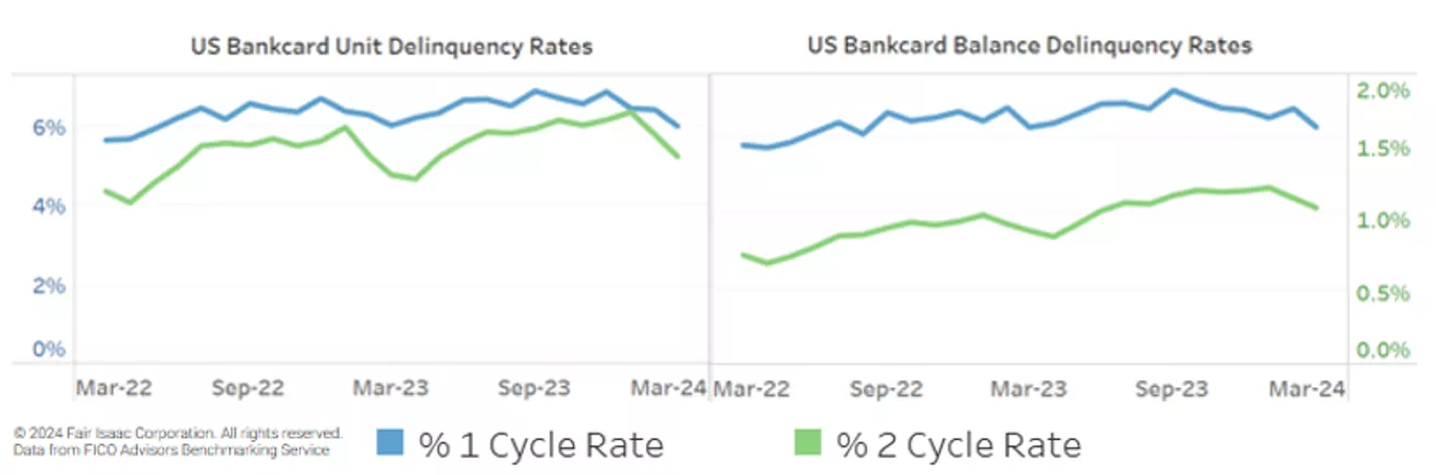In addition to 1-cycle rates flattening, growth in the proportion of consumers missing two payments is slowing as well. Instead of 30-50% year-over-year increases, the proportion of credit card accounts that are two payments past due is 9.6% higher in March 2024 compared to March 2023 and the proportion of credit cards balances that are two payments past due is 17.2% higher year-over-year.